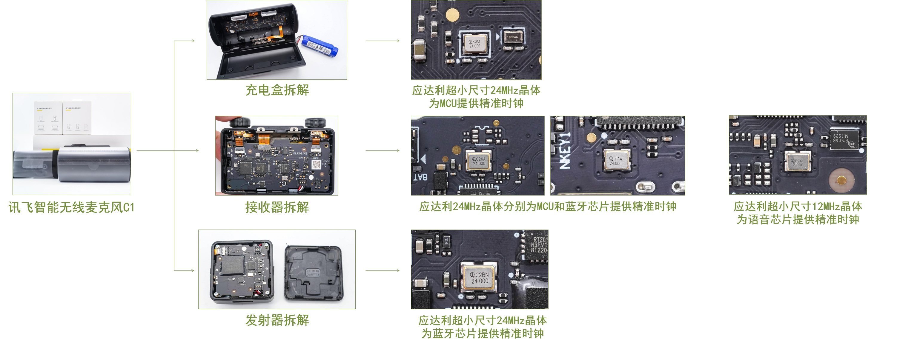 接收器搭載了HDSC華大HC32F460KEUA微控制器,和Actions炬芯ATS2831PL藍牙音頻SoC,采用2顆應達利24MHz無源晶振分別為MCU和藍牙芯片提供時鐘。同時搭載NationalChip杭州國芯GX8008C AI語音處理芯片,采用應達利12MHz晶體為語音芯片提供時鐘。