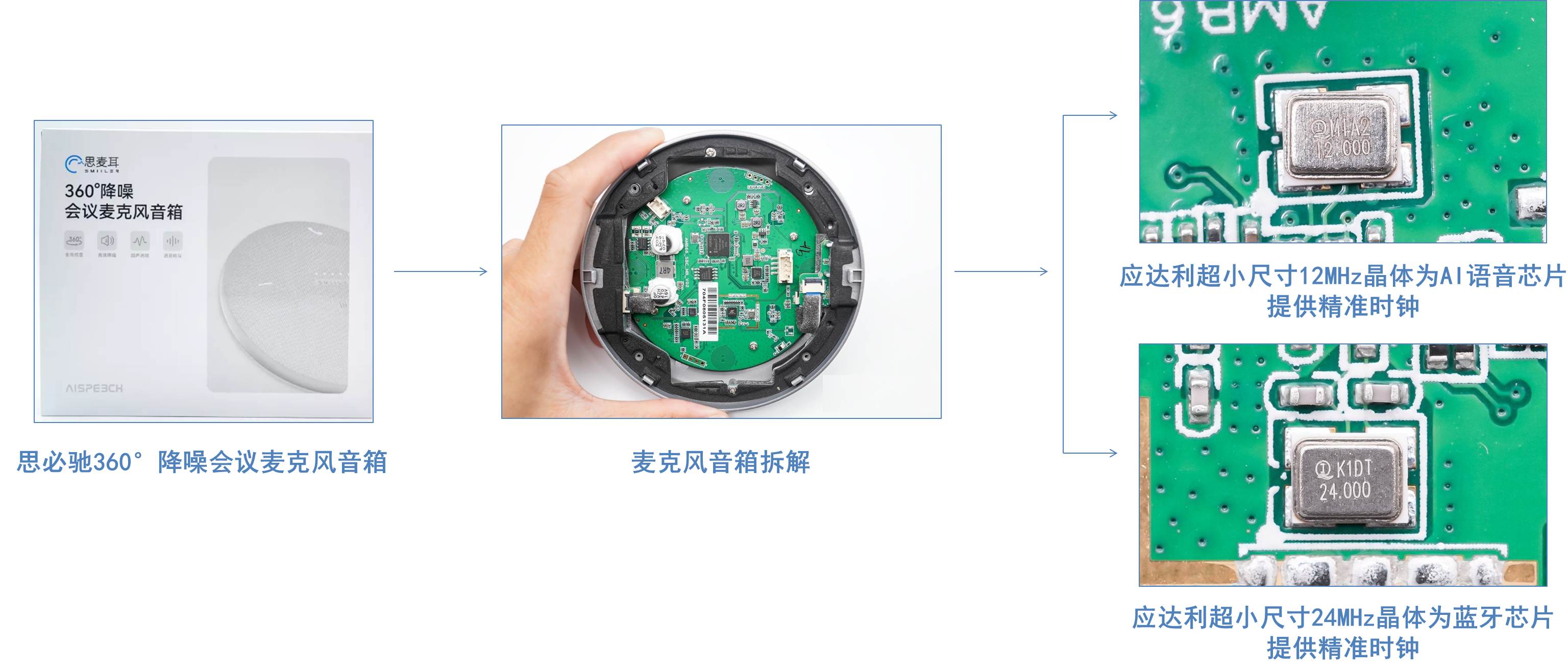 思必馳360°降噪會議麥克風音箱,搭載思必馳自研AI語音芯片ShensiliCon深聰智能TH1520-GMA,應達利12MHz無源晶振為AI語音芯片提供時鐘,協同應達利24MHz晶體為藍牙芯片提供時鐘信號。